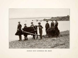 This is an original 1930 black and white halftone print of Acadian boys collecting eelgrass which is also known as Zostera. It is a type of seagrass that can be used for food or dried and used for insulating homes in the winter. Acadia was a colony of New France in the 17th century which is now Nova Scotia, Canada.