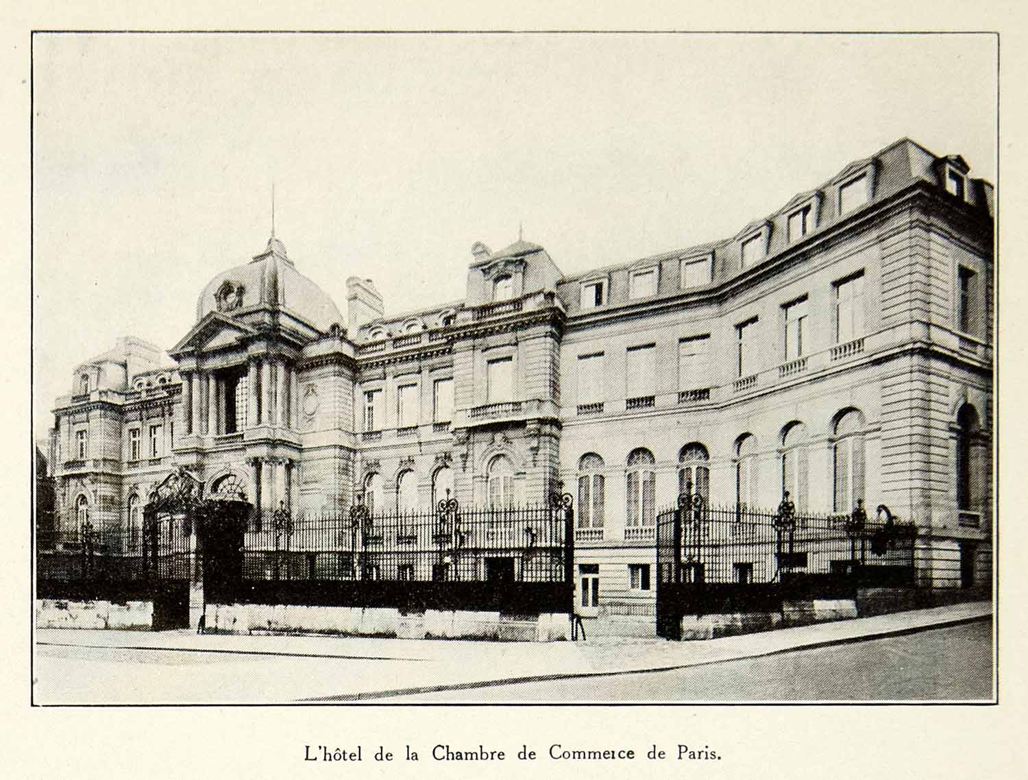 This is an original 1930 black and white halftone print of the building that houses the Parisian Chamber of Commerce (CCIP).