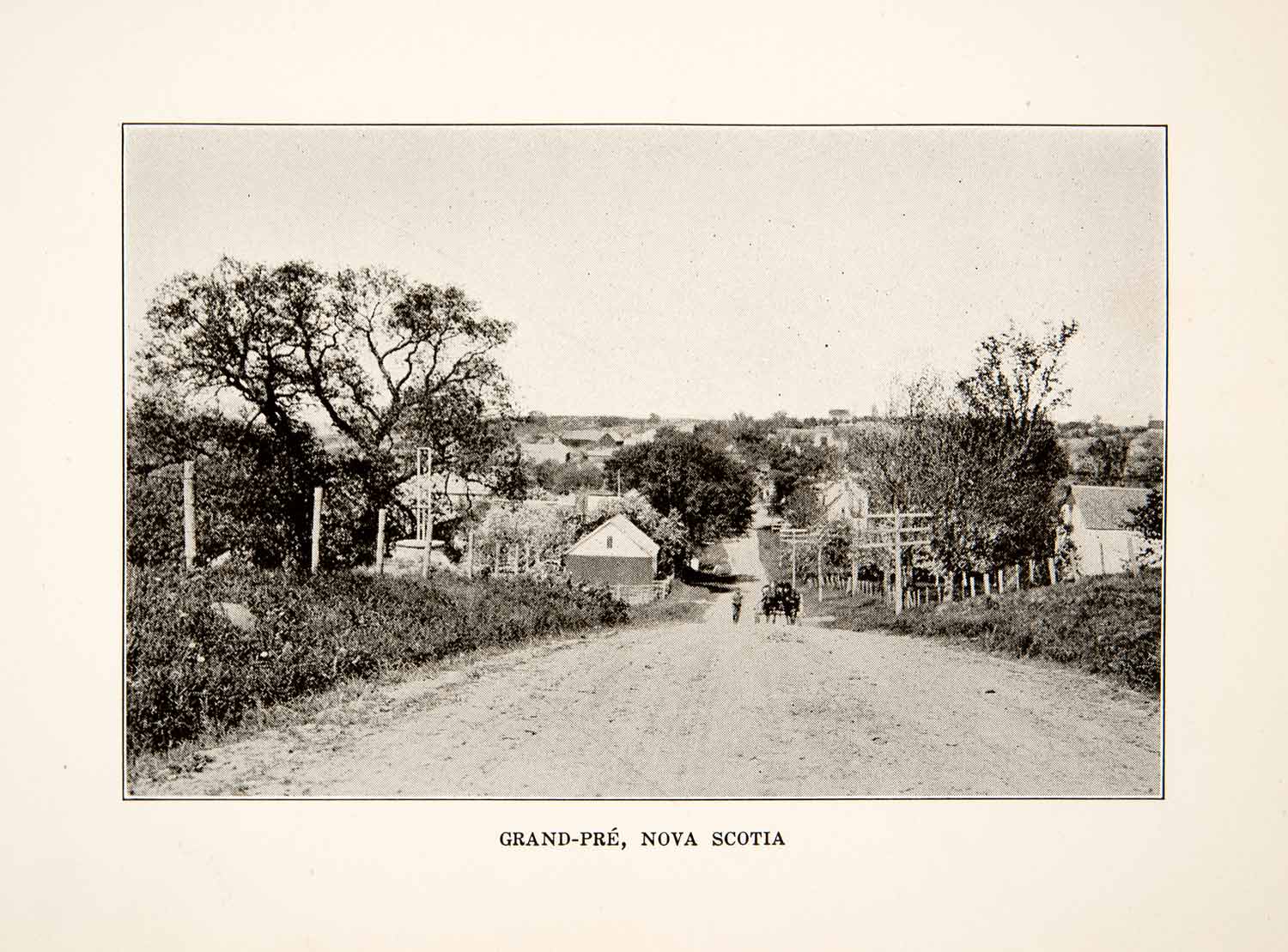 This is an original 1930 black and white halftone print of a street in the rural community of Grand-Pré in Nova Scotia, Canada. It is in the area of Acadia which was a colony of New France in the 17th century.
