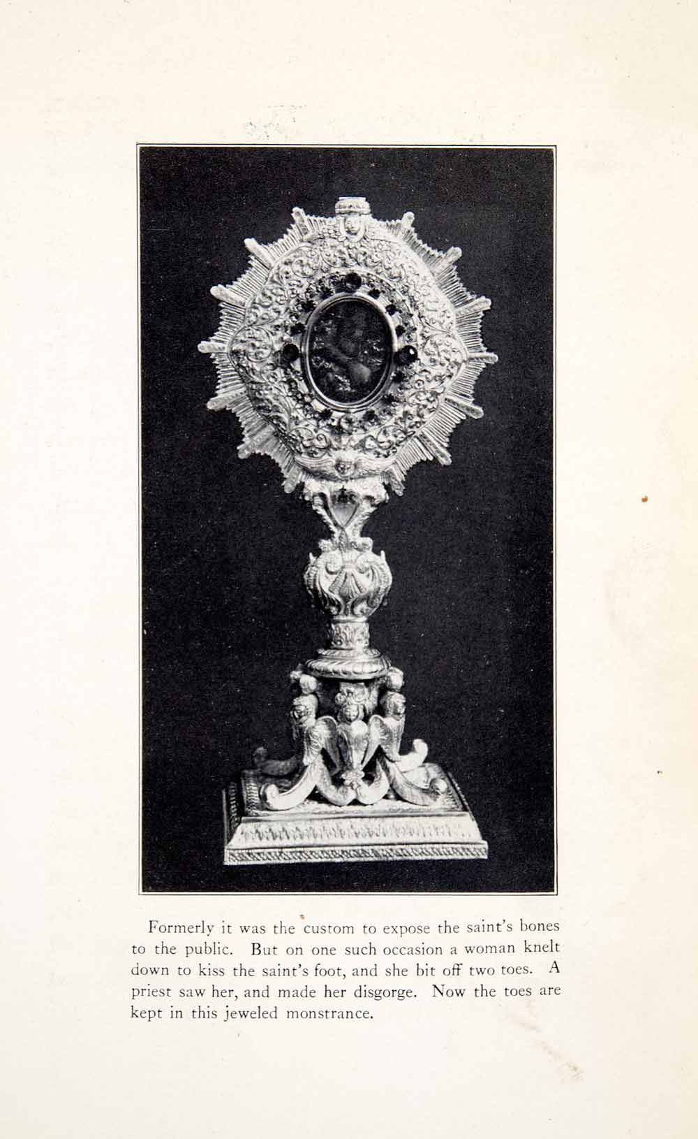 This is an original 1930 black and white halftone print of jeweled monstrance of the toes of a saint, which happened to be bitten off by a woman who knelt down to kiss his toes.