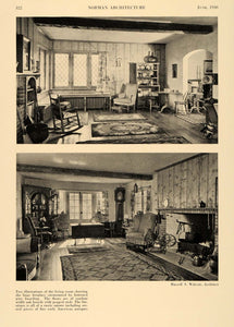 This is an original 1930 halftone print showing a living room with a huge fireplace surmounted by battened pine boarding. The floors are of random width oak boards with pegged ends. The furniture is all of a rustic nature including several pieces of fine early American antiques.