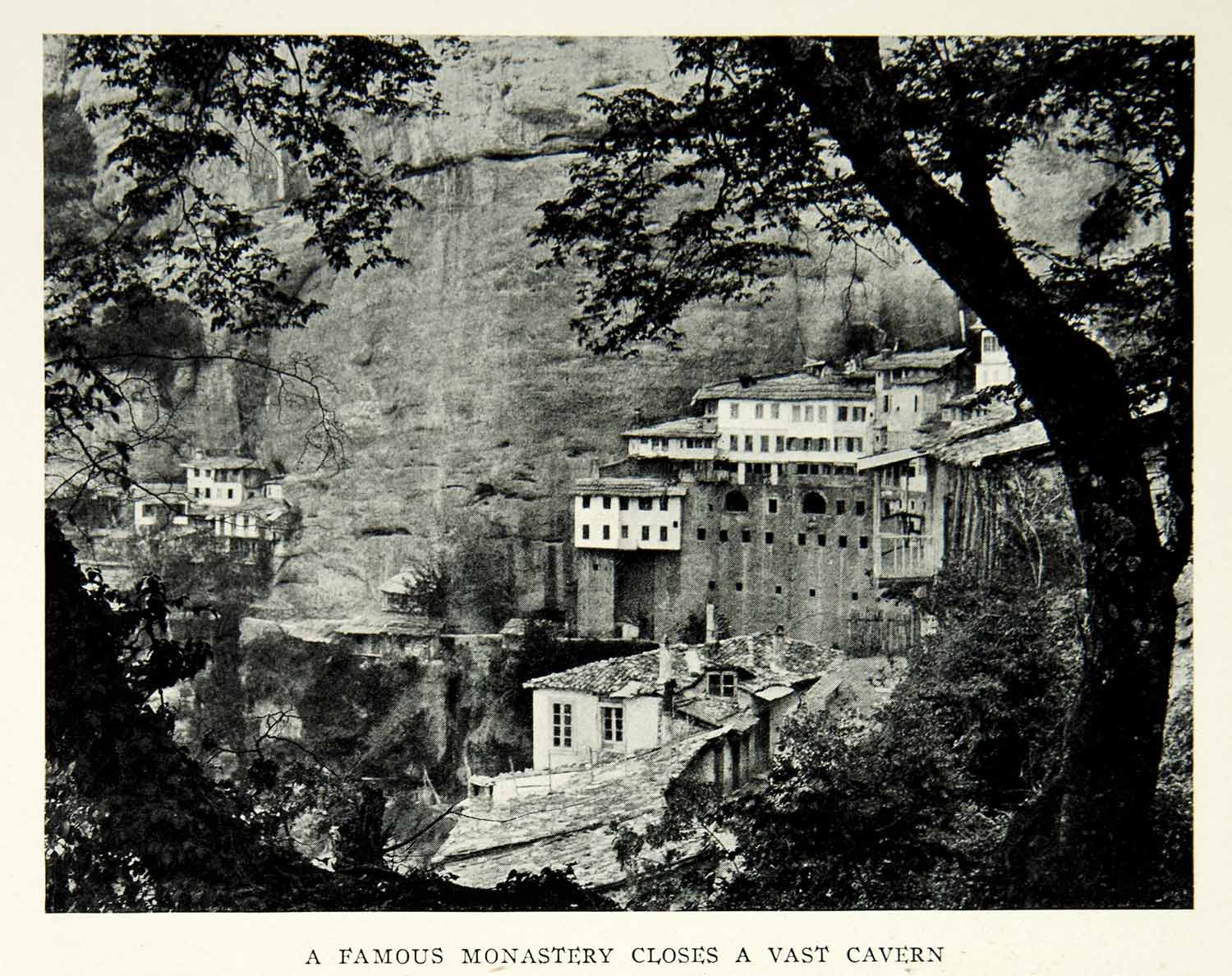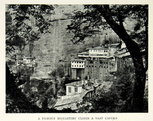 This is an original 1930 black and white halftone print of "A Famous Monastery Closes a Vast Cavern," referring to the Great Cave (Mega Spelaion) Orthodox Church in Greece.