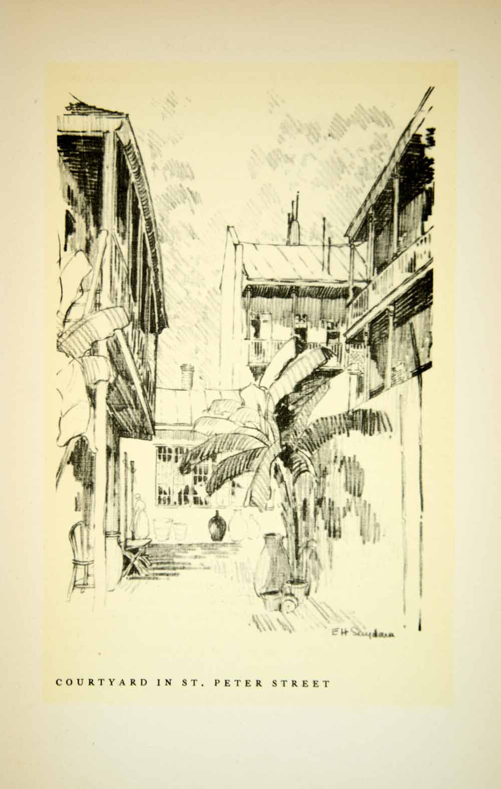 This is an original 1930 black on cream stock halftone print of a drawing by artist, Edward Howard Suydam (1885-1940), of a courtyard in St. Peter Street in the historic French Quarter of New Orleans.