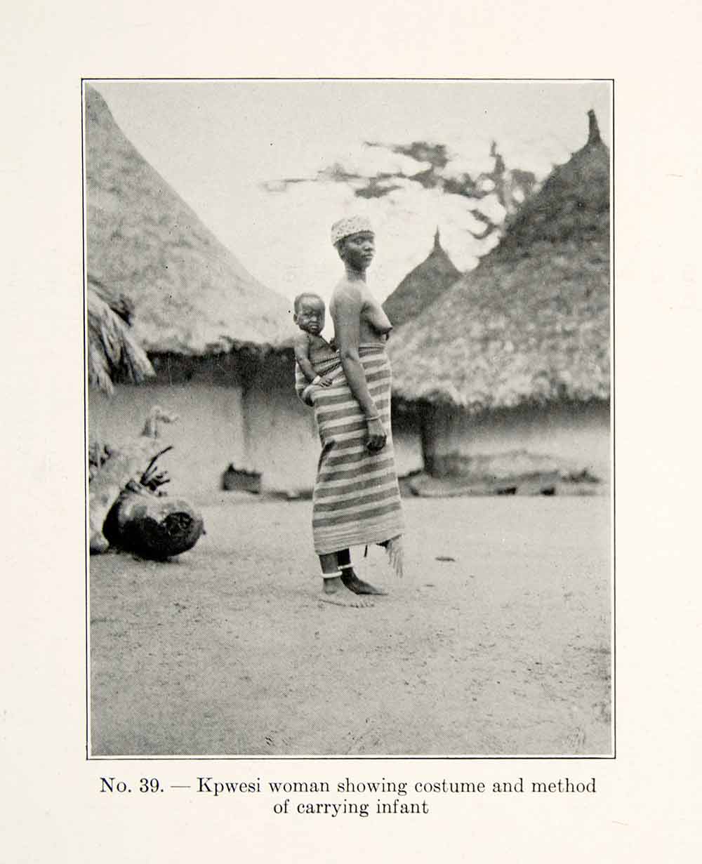 This is an original 1930 black and white halftone print of a Kpwesi woman showing the typical method for carrying in infant, as well as the everyday clothing worn by the women of the tribe.