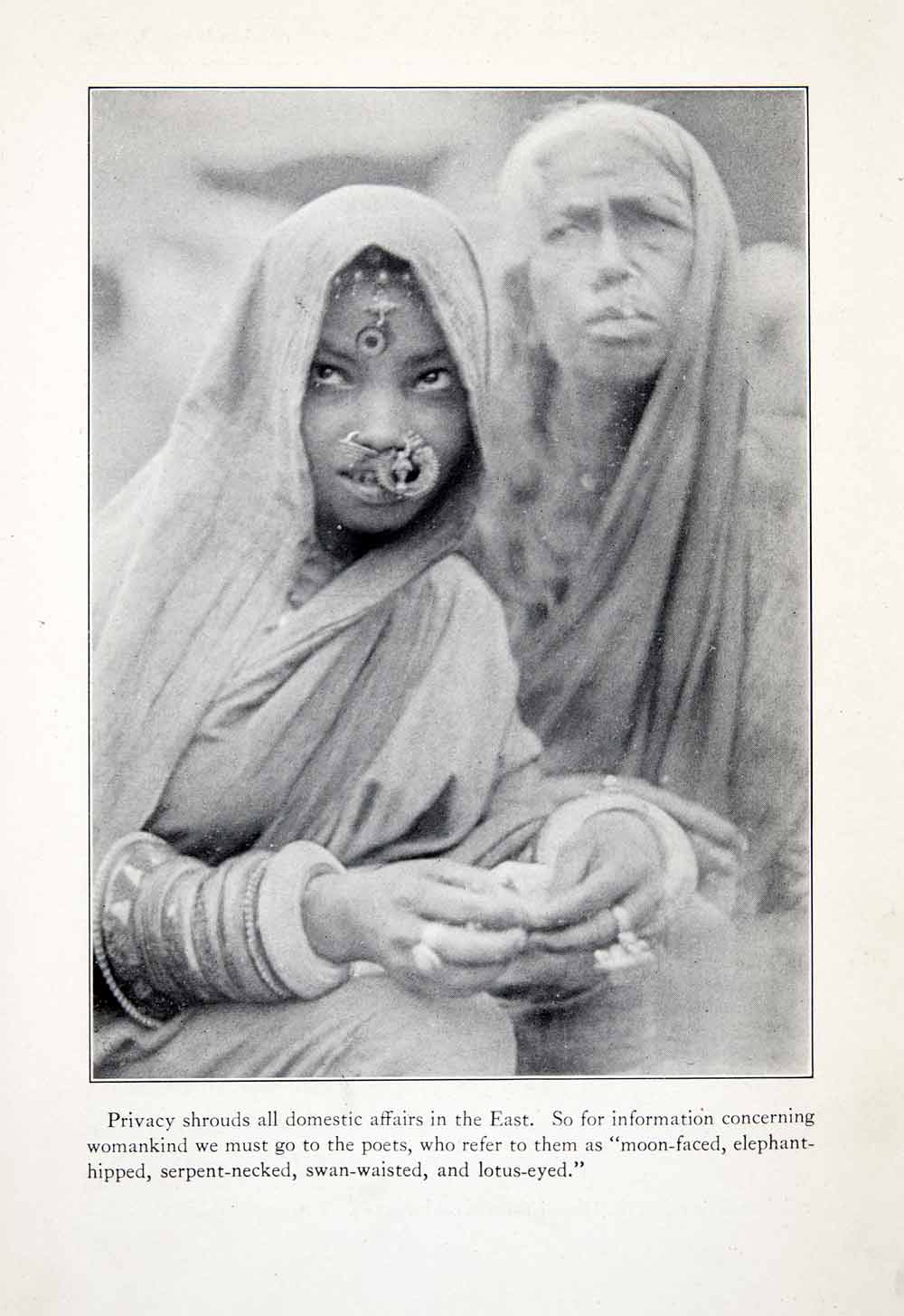 This is an original 1930 black and white halftone print of a portrait of Indian women. They are described as "moon-faced, elephant-hipped, serpet-necked, swan-waisted, and lotus-eyed."