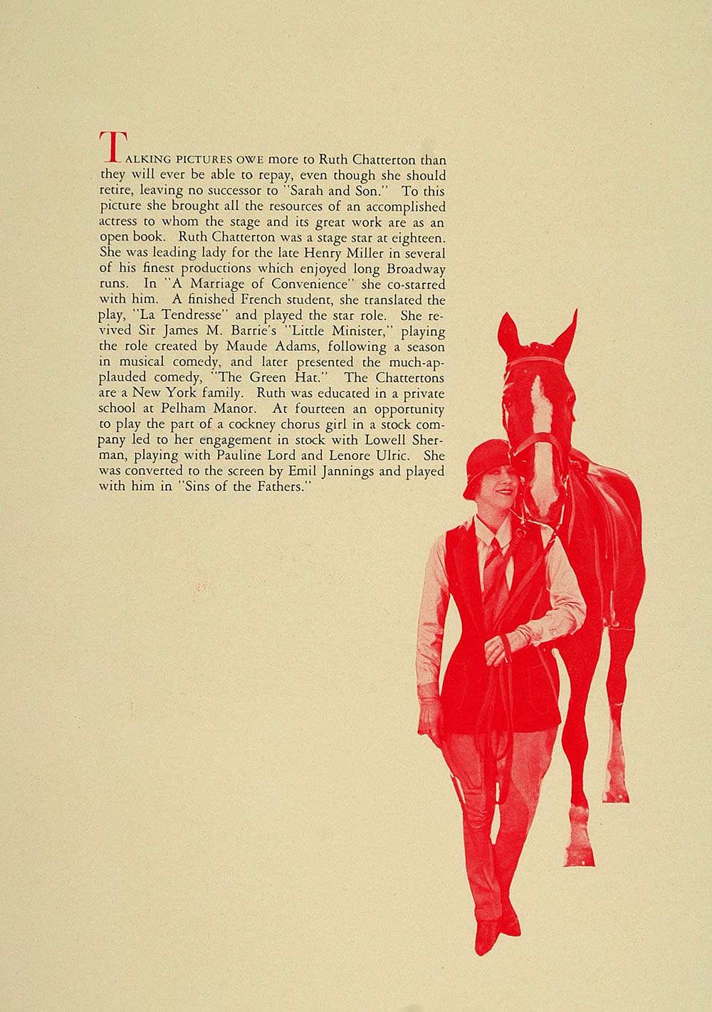 This is an original 1930 color print portrait of Paramount film star and stage actress, Ruth Chatterton (1893-1961). On the reverse is a brief biographical description. Please see both images.