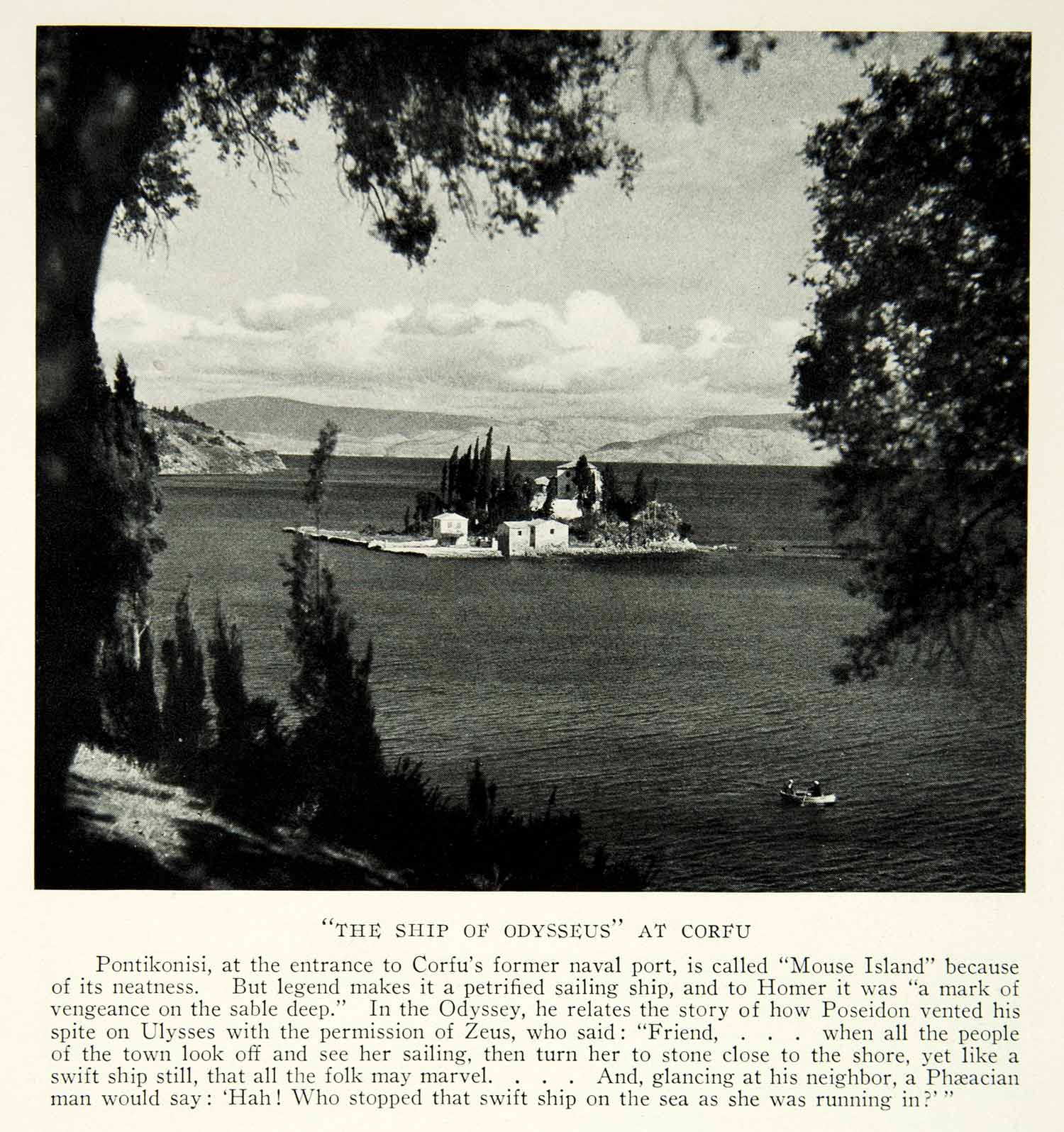 This is an original 1930 black and white halftone print of "The Ship of Odysseus," at Corfu, an island of Greece in the Ionian Sea.