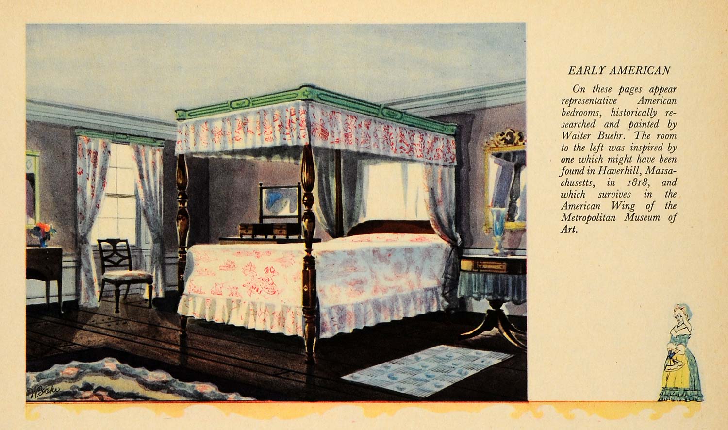 This is an original 1930 color print of an image by Walter Buehr, who was inspired by an 1818 bedroom found in Haverhill, Massachusetts and remains in the American Wing of the Metropolitan Museum of Art.