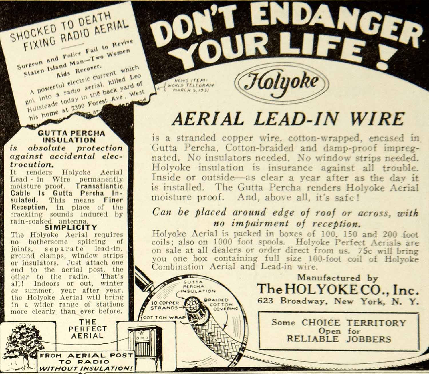 This is an original 1931 black and white print ad for Aerial Lead-In Wire from the Holyoke Company, Inc.