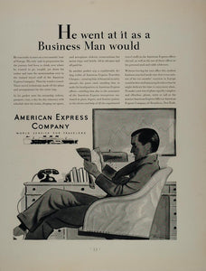 This is an original 1931 print ad for the American Express Company, 65 Broadway New York City. The ad has a nice illustration of a businessman at his desk.