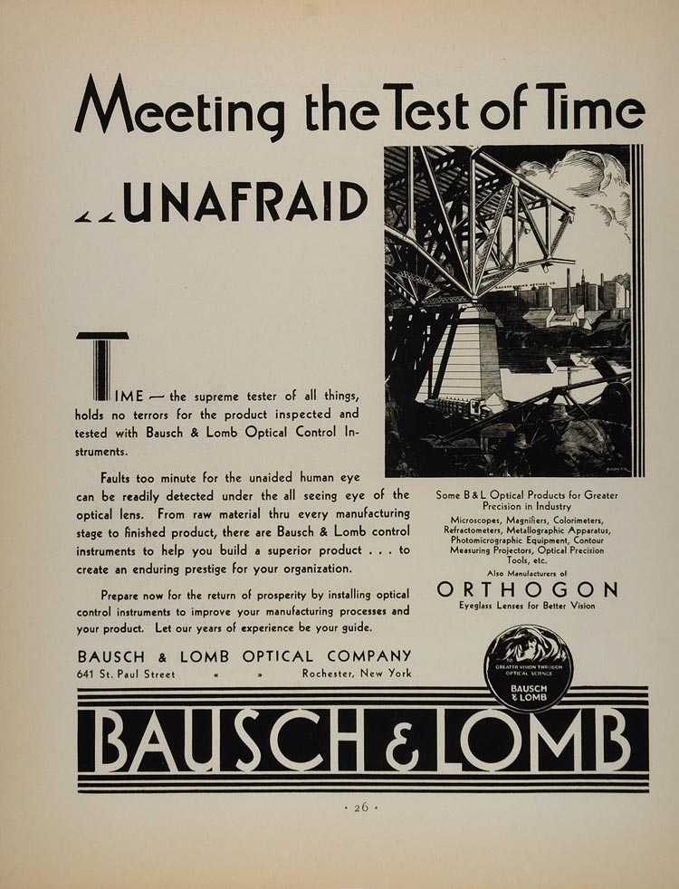 This is an original 1931 black and white print ad for the Bausch & Lomb Optical Company, 641 St. Paul Street, Rochester, NY.