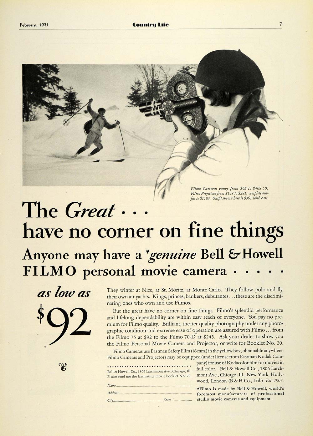 This is an original 1931 black and white print ad for the Filmo Cameras, Filmo Projectors from Bell and Howell Company located at 1806 Larchmont Avenue, Chicago, Illinois.