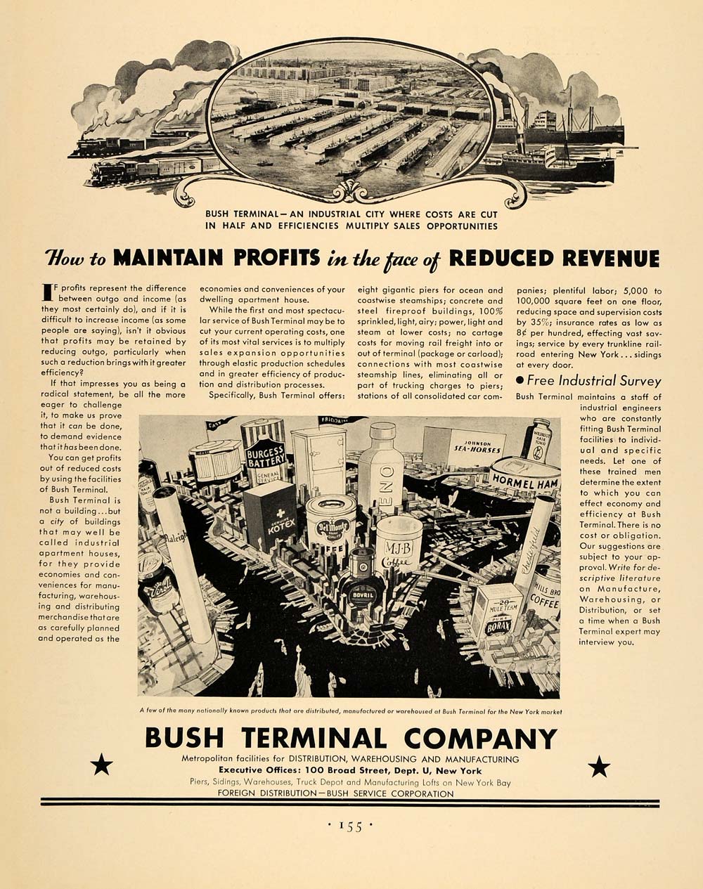 This is an original 1931 black and white print ad for Bush Terminal Company. This company is located near Sunset Park in Brooklyn, New York. It is known for being the largest integrated distribution and manufacturing center, warehouse, and shipping port for railroad, marine and other carriers in the world. Some examples of products that pass through the hub are Kotex, Del Monte, Hormel, Chesterfield Cigarettes, and Hills Bros. Coffee to name a few.