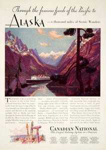 This is an original 1931 color print ad for "Inside Passage" railroad and cruise ship routes through the scenic Alaskan wilderness that were offered by the Canadian National Railway during the Great Depression era.