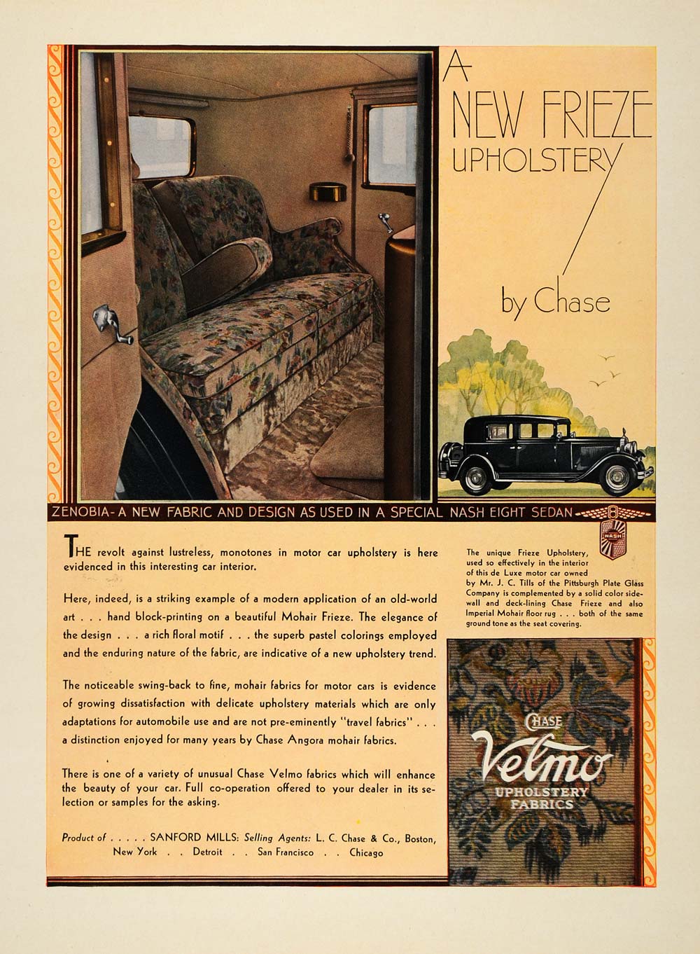 Keywords specific to this image: design fabric, mohair frieze, car interior, seat covering, Nash eight sedan, art Vintage Advertising