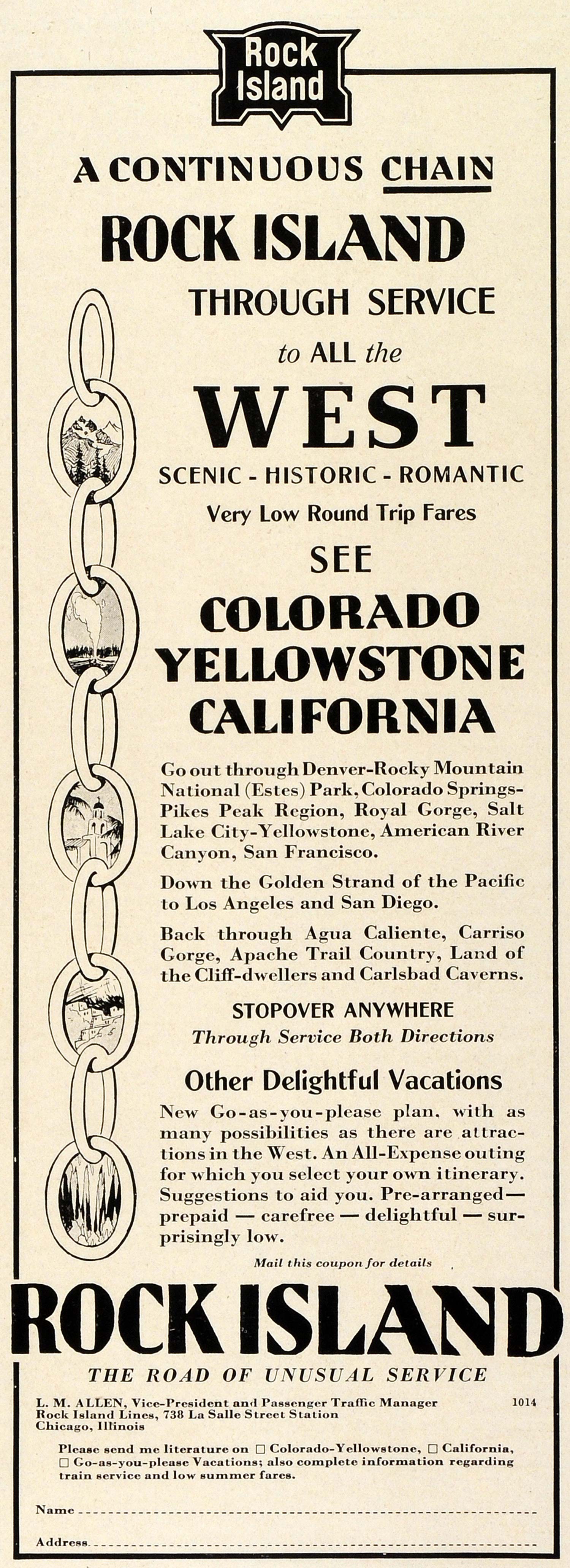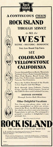 This is an original 1931 black and white print ad promoting travel in Colorado, Yellowstone and California from the Chicago, Rock Island and Pacific Railroad, also known as the Rock Island Line. Vice-president and Passenger Traffic Manager: L. M. Allen, 738 La Salle Street Station, Chicago, Illinois. The Rock Island was a Class I Railway in the United States.