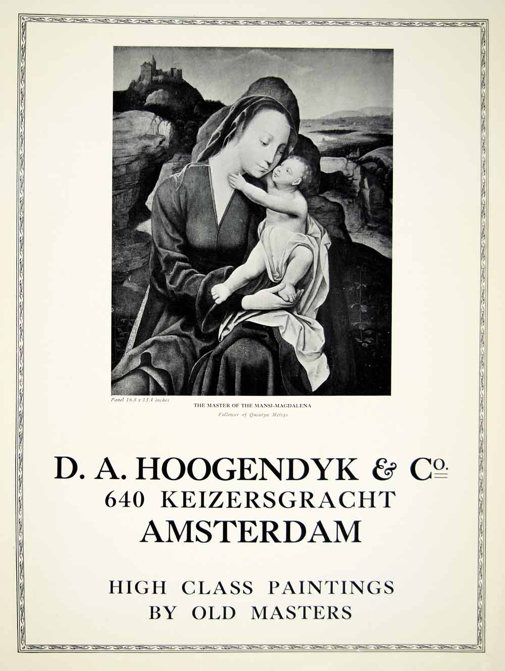 Keywords specific to this image: Vintage Advertising, Antiques, Company, Business, Exhibition, Madonna, Baby, Child, Infant, Jesus Christ, Landscape, Religious, Mother, Pose, Woman, Female, Lady, Quentin Matsys, Antwerp School, Flemish