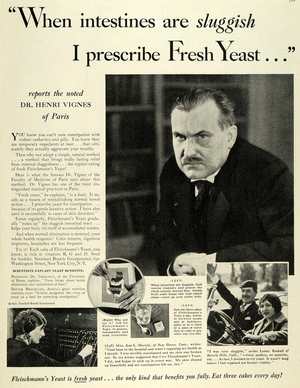 This is an original 1931 black and white print ad for Standard Brands, Incorporated, of 691 Washington Street in New York City. This ad features their Fleischmann's Yeast for intestinal health, as reported on by Dr. Henri Vignes of Paris.