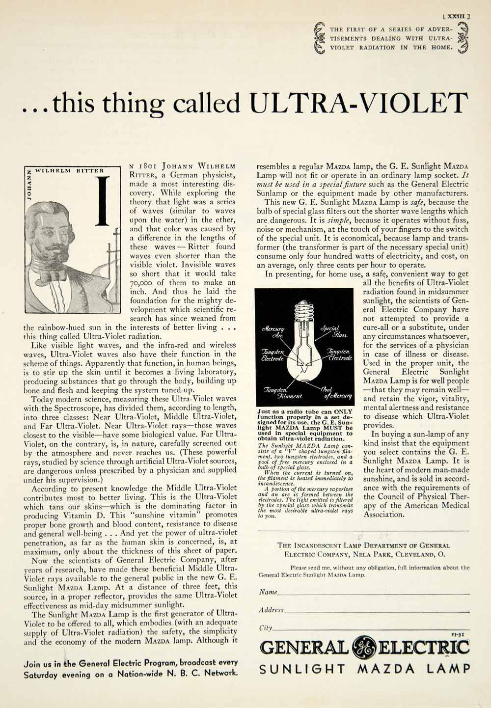 This is an original 1931 black and white print ad for the Sunlight Mazda Lamp that was made and sold by the Incandescent Lamp Dept. of the General Electric Company of Nela Park, Cleveland, Ohio (OH). The ad also features a small, Art Deco style portrait of German physicist Johann Wilhelm Ritter (1776-1810) in honor of his research about Ultra Violet light and its radiation.