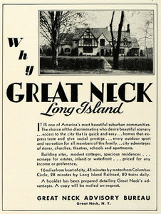 This is an original 1931 black and white print ad for the Great Neck Advisory Bureau of Great Neck, Long Island, New York, encouraging residency in the area.