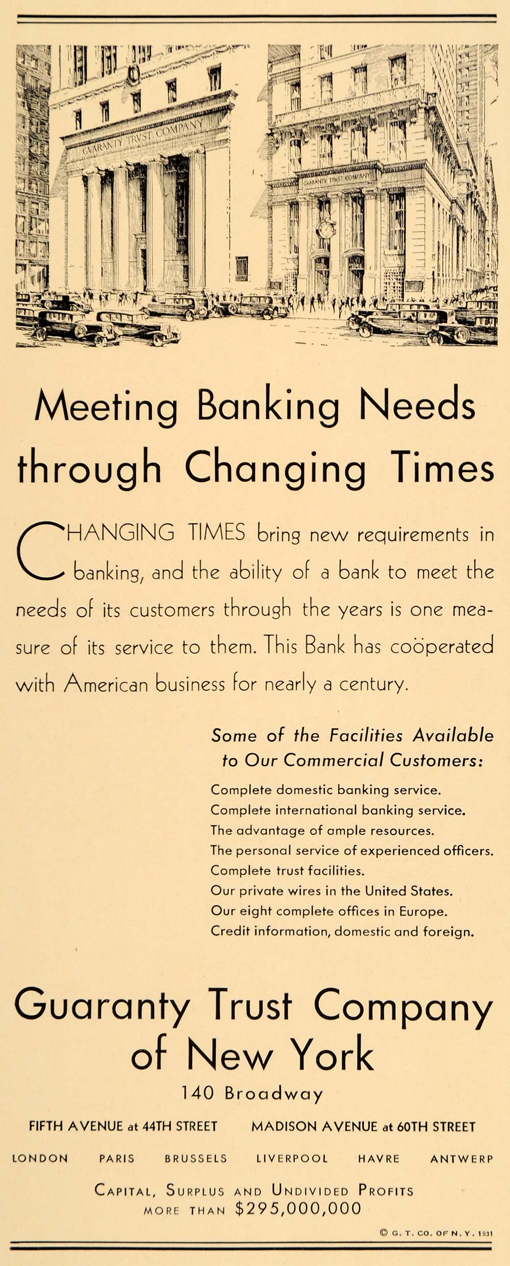 This is an original 1931 black and white print ad for the Guaranty Trust Company of New York located at 104 Broadway, New York.