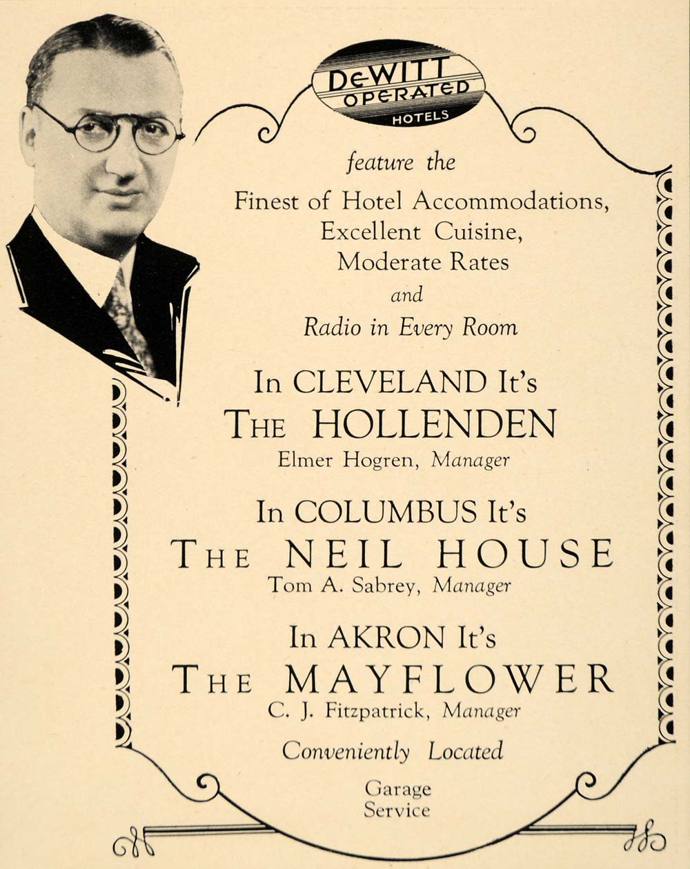 This is an original 1931 black and white print ad for the Hollenden Hotel in Cleveland, The Neil House Hotel in Columbus and The Mayflower in Akron.