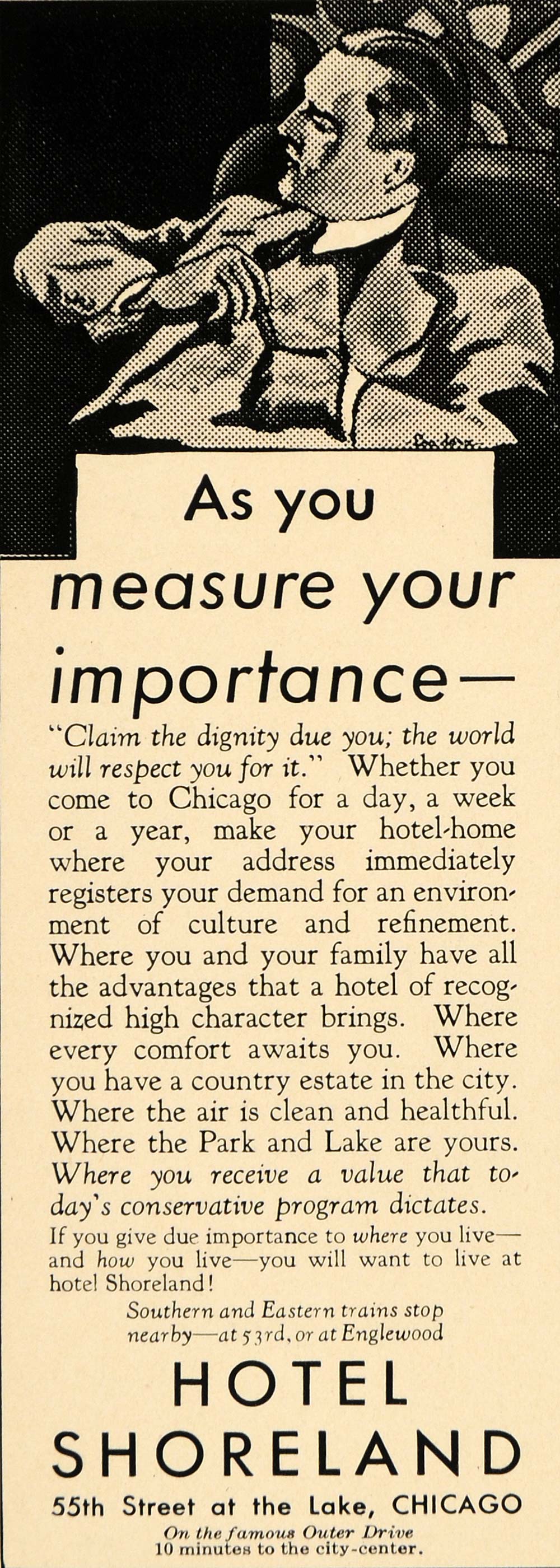 This is an original 1931 black and white print ad for the Hotel Shoreland located at 55th Street at the lake, Chicago.