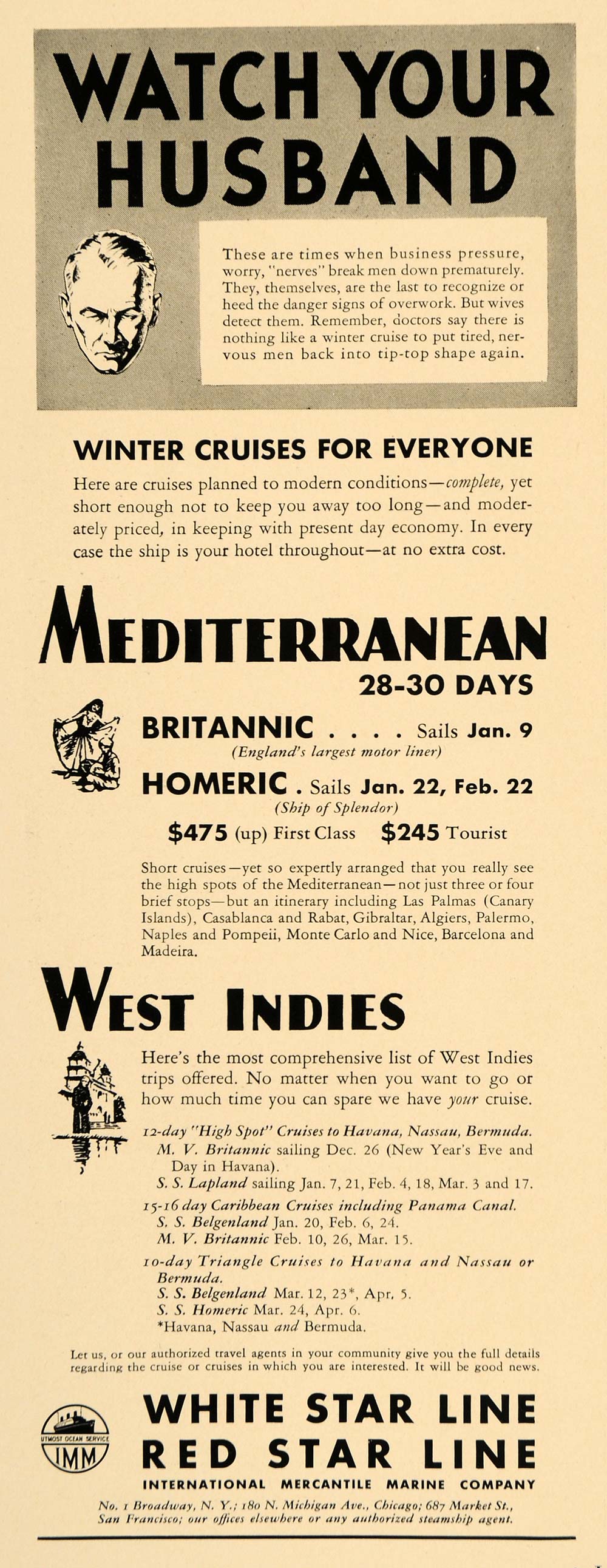 Keywords specific to this image: red star line, west Indies trip, Mediterranean trip, Britannic ship, Homeric trip, cruises, husband Vintage Advertising