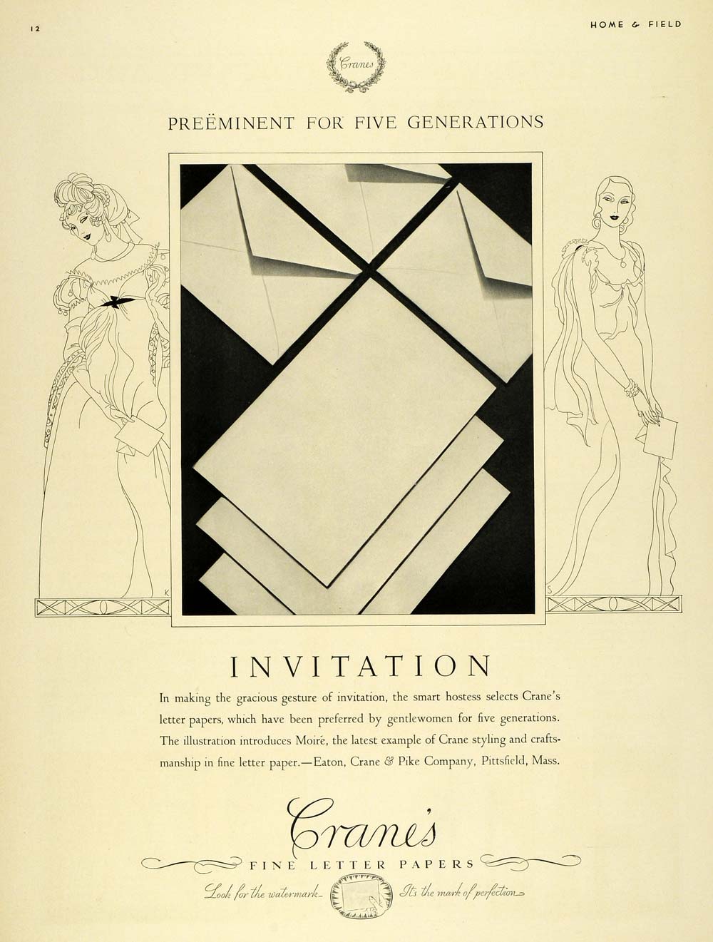 This is an original 1931 black and white print ad for the Crane's Fine Letter Papers from Eaton, Crane & Pike Company, Pittsfield, Massachusetts.