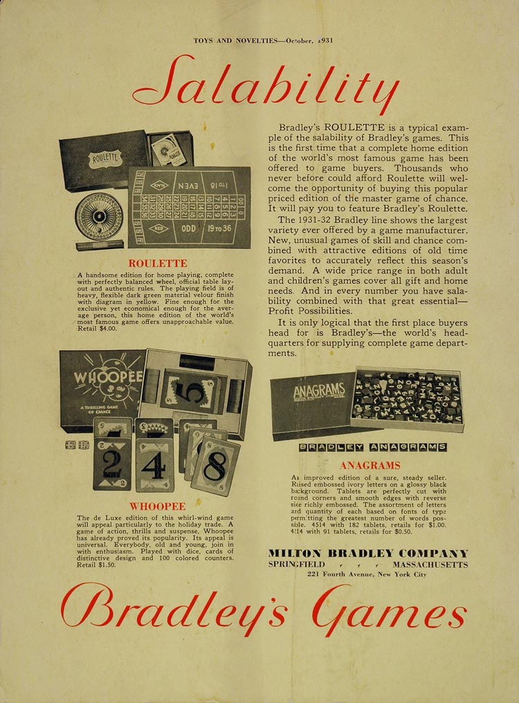 This is an original 1931 two-color print ad for several Milton Bradley games--Roulette, Whoopee, and Anagrams from the Milton Bradley Company of Springfield, Massachusetts.