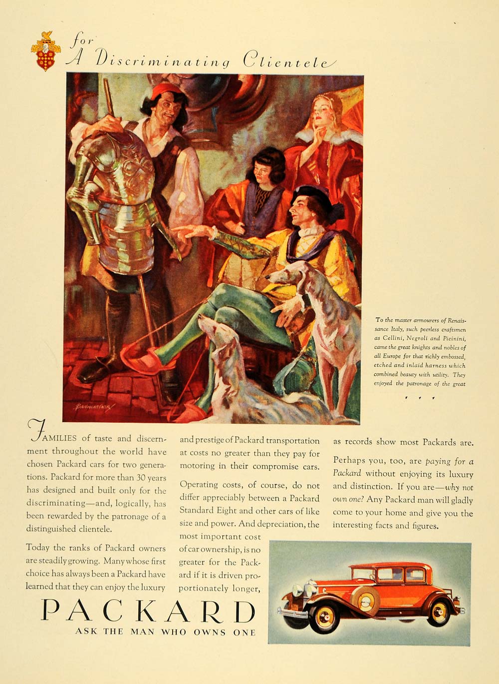 This is an original 1931 color print ad for the Packard Standard Eight automobile series, featuring a stunning illustration by Baumgartner of Renaissance Italy and its famed craftsmen Cellini, Negroli and Pieinini.