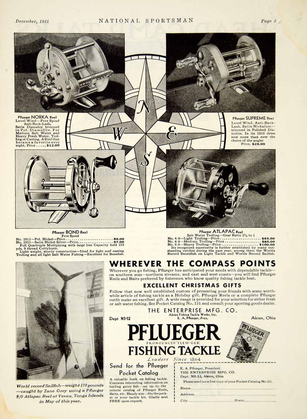 Keywords specific to this image: Vintage Advertising, Fish, Fisherman, Level Wind, Spool, Anti-Backlash, Satin Nickalum, Sporting Goods, Outfitters, Equipment, Outdoors, Sportsman, Salt Water, Trolling, Gear, Compass, Bait, Zane Grey, Swordfish, Enterprise Manufacturing Company, Pole, Rod