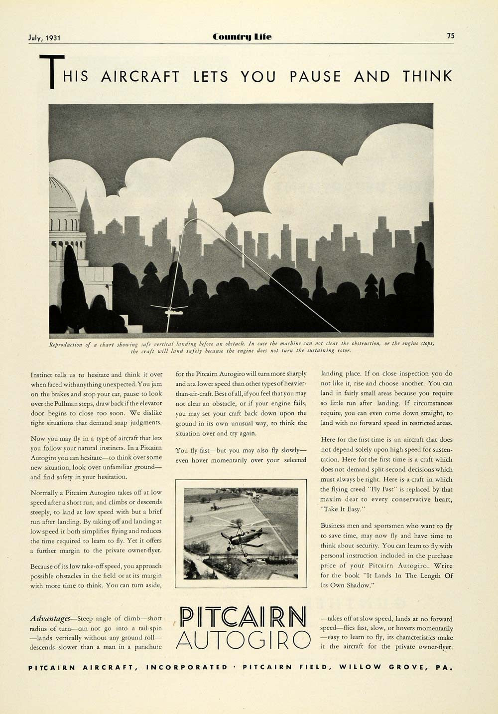 This is an original 1931 black and white print ad for the Pitcairn Autogiro, a product by Pitcairn Aircraft, Inc. of Willow Grove, Pennsylvania.