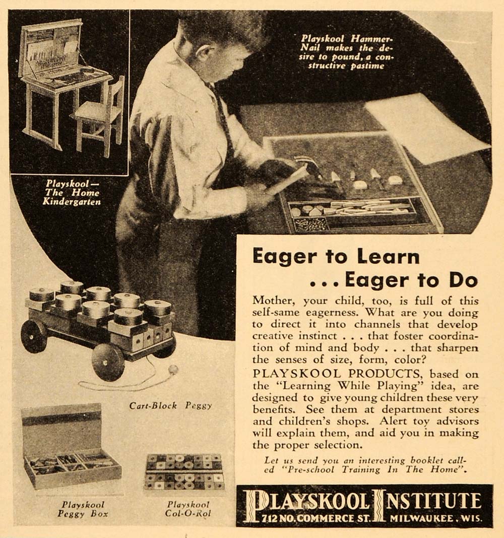 This is an original 1931 black and white print ad for Playskool educational toys including the Playskool Home Kindergarten; Playskool Hammer-Nail; Cart-Block Peggy; Playskool Peggy Box; and the Playskool Col-O-Rol, from the Playskool Institute, 712 No. Commerce St., Milwaukee, WI.