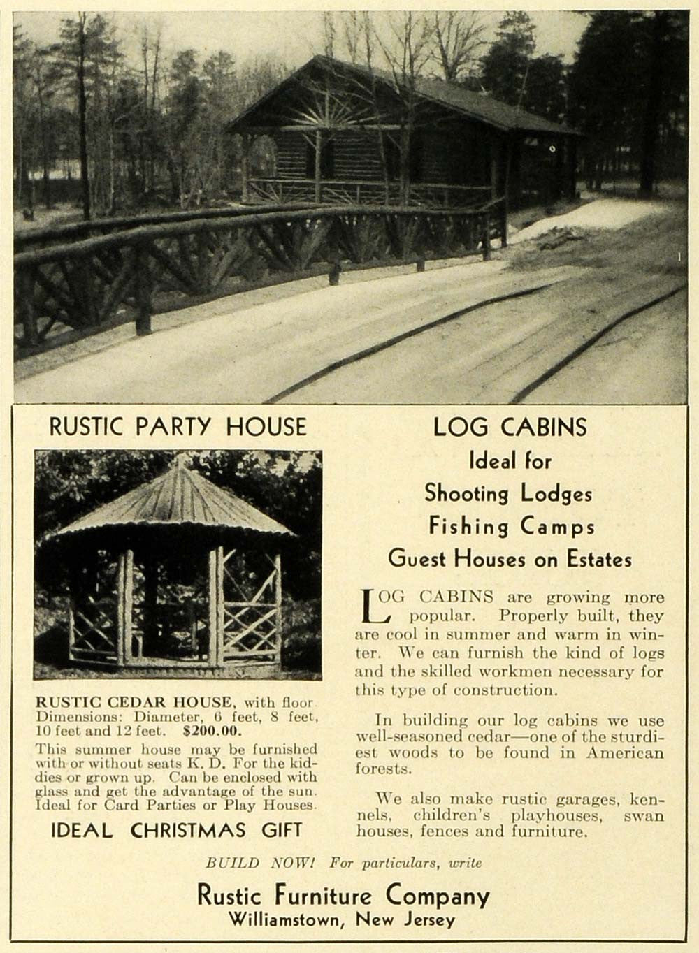 This is an original 1931 black and white print ad for the Log Cabins and Rustic Party House ideal for shooting lodges, fishing camps and guest houses on estates from Rustic Furniture Company located in Williamstown, New Jersey.