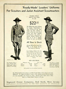 This is an original 1931 black and white print ad for the Junior Assistant Scoutmaster and Ready-Made Leaders' Boy Scouts uniforms that were made and sold by the Sigmund Eisner Company of Red Bank, New Jersey (NJ).