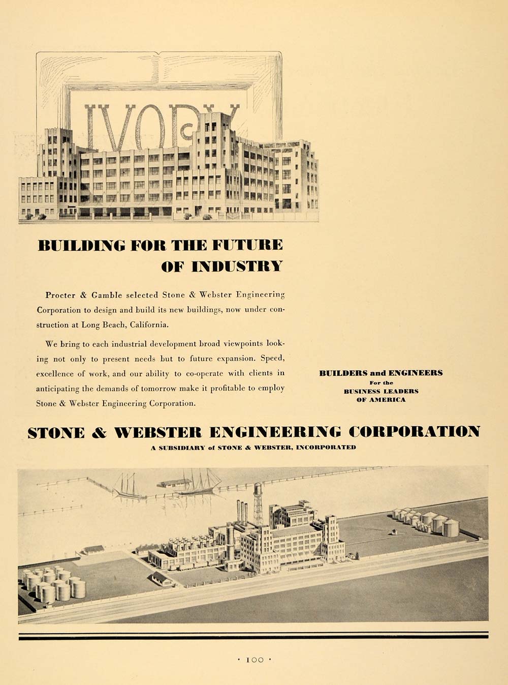 This is an original 1931 black and white print ad for Stone & Webster Engineering Corporation, featuring the Procter and Gamble Building in Long Beach, California.