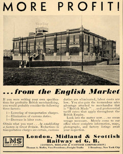 This is an original 1931 black and white print ad for the London, Midland & Scottish Corporation, Railway of G. B. located in New York City.
