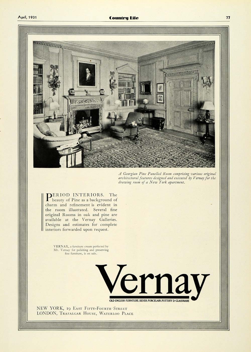 This is an original 1931 black and white print ad for Vernay Old English Furniture, Silver, Porcelain, Pottery and Glassware. This particular ad features an image of a Georgian Pine Paneled room of a New York apartment, which was designed and furnished by Vernay.