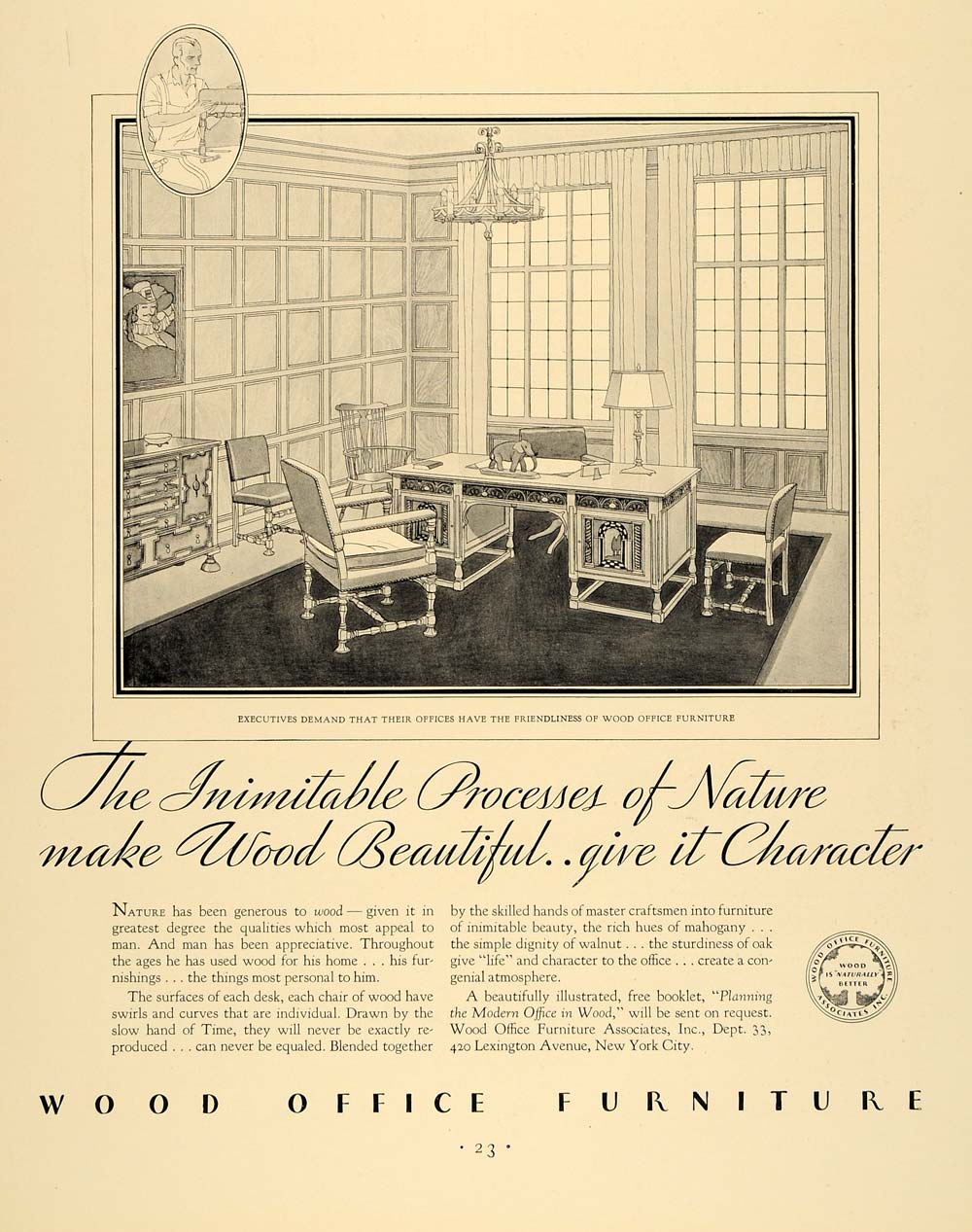 This is an original 1931 black and white print ad for the Wood Office Furniture Associates, Incorporation, Department 33 located at 420 Lexington Avenue, New York.