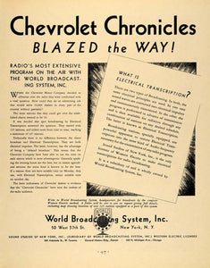 This is an original 1931 black and white print ad for World Broadcasting System with Spot Broadcasting and Electrical Transcription coupled with the Chevrolet Chronicles.
