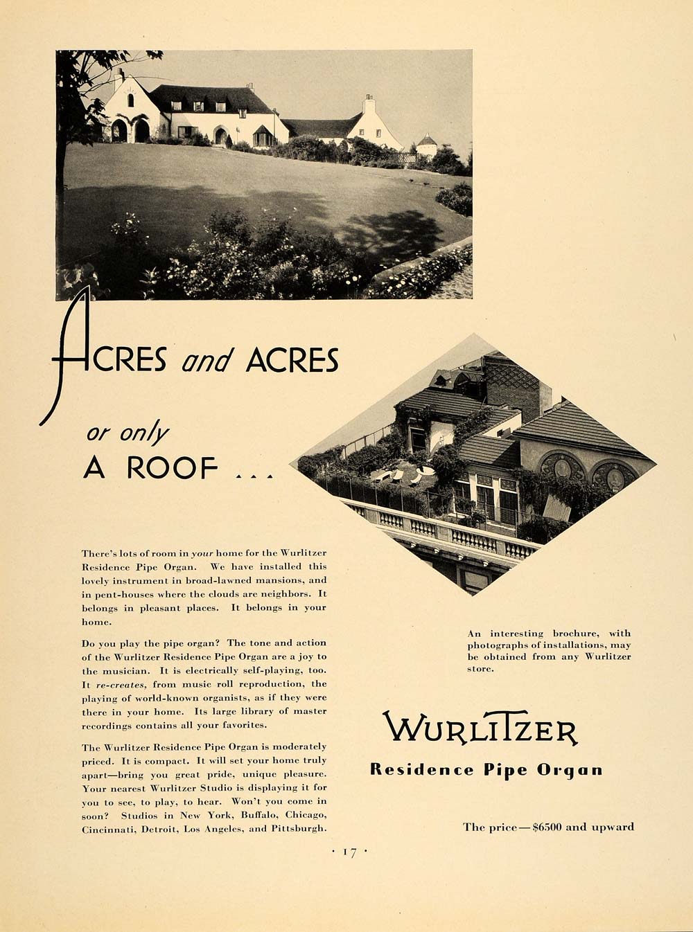 This is an original 1931 black and white print ad for the Wurlitzer Residence Pipe Organ.
