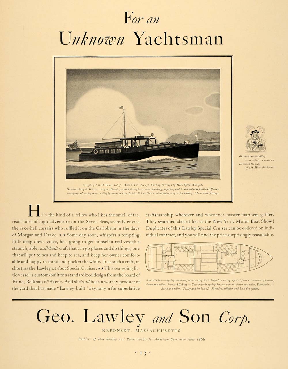 This is an original 1931 black and white print ad for the George Lawley and Son Corporation in Neponset, Massachusetts. Founder, George Lawley, was born in London to a family of boat builders. He moved his family business to Massachusetts around 1874, during the yacht boom. In 1885 and 1886, two of Lawley's company's boats, the Puritan and the Mayflower, won America's Cup.