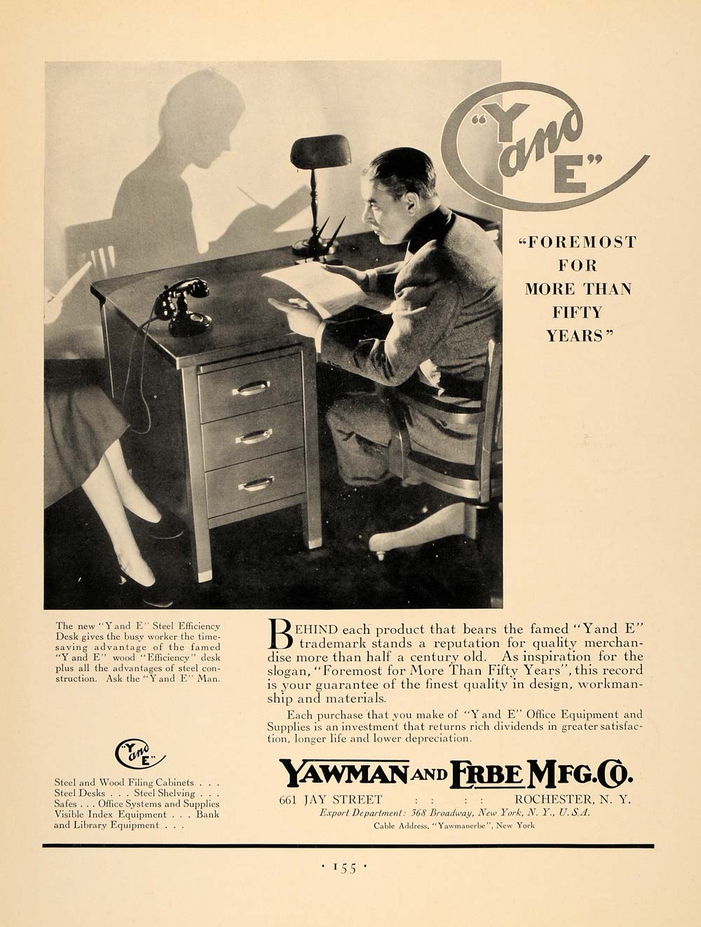 This is an original 1931 black and white print ad for the Y and E office equipment and supplies from Yawman and Erbe MFG Company located at 661 Jay Street, Rochester, NY.