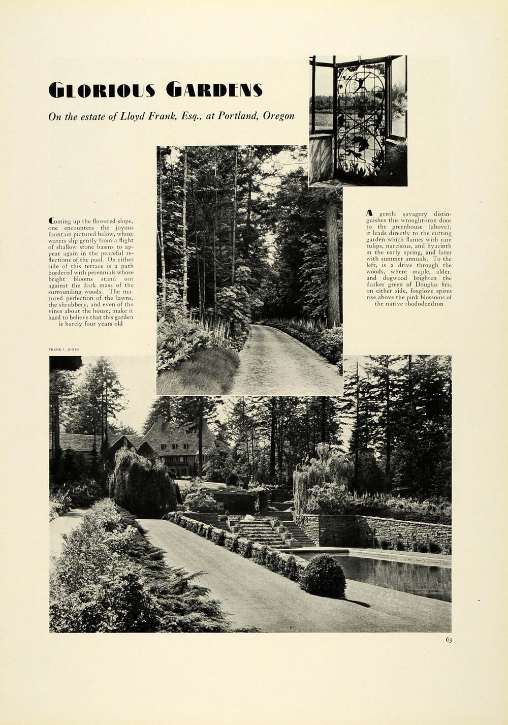 This is an original 1931 one-page article (one single-sided page) of the stunning gardens and landscape architecture on the estate of Lloyd Frank in Portland, Oregon. Photography courtesy of Frank I. Jones.