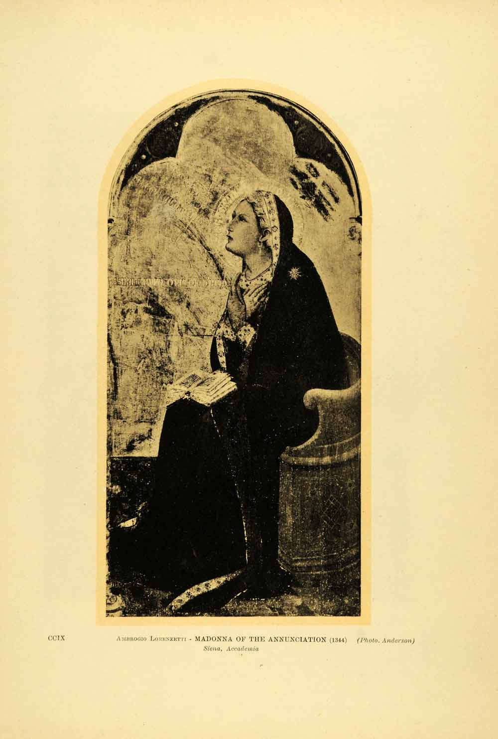 This is an original 1931 two-color collotype of a late medieval piece by Italian artist Ambrogio Lorenzetti which depicts the Virgin Mary moments before she receives the news from the angel Gabriel during the Annunciation that she has been chosen to bear the Son of God.