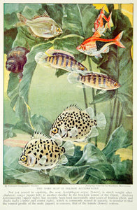 This is an original 1931 color print of the Scatophagus, Ambasis ranga, Rasbora heteromorpha and the Badis badis fish.