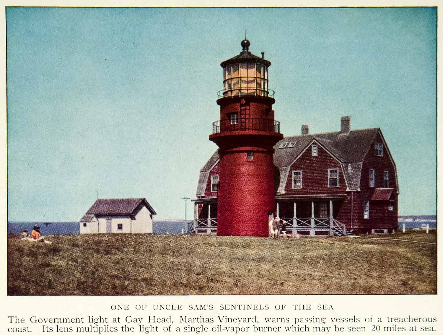This is an original 1931 color print of the Government operated Lighthouse at Gay Head, Marthas Vineyard in Massachusetts.