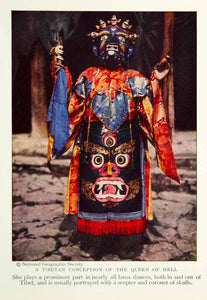 This is an original 1931 color print of a Tibetan Buddhist dancer in the traditional costume of the Queen of Hell.