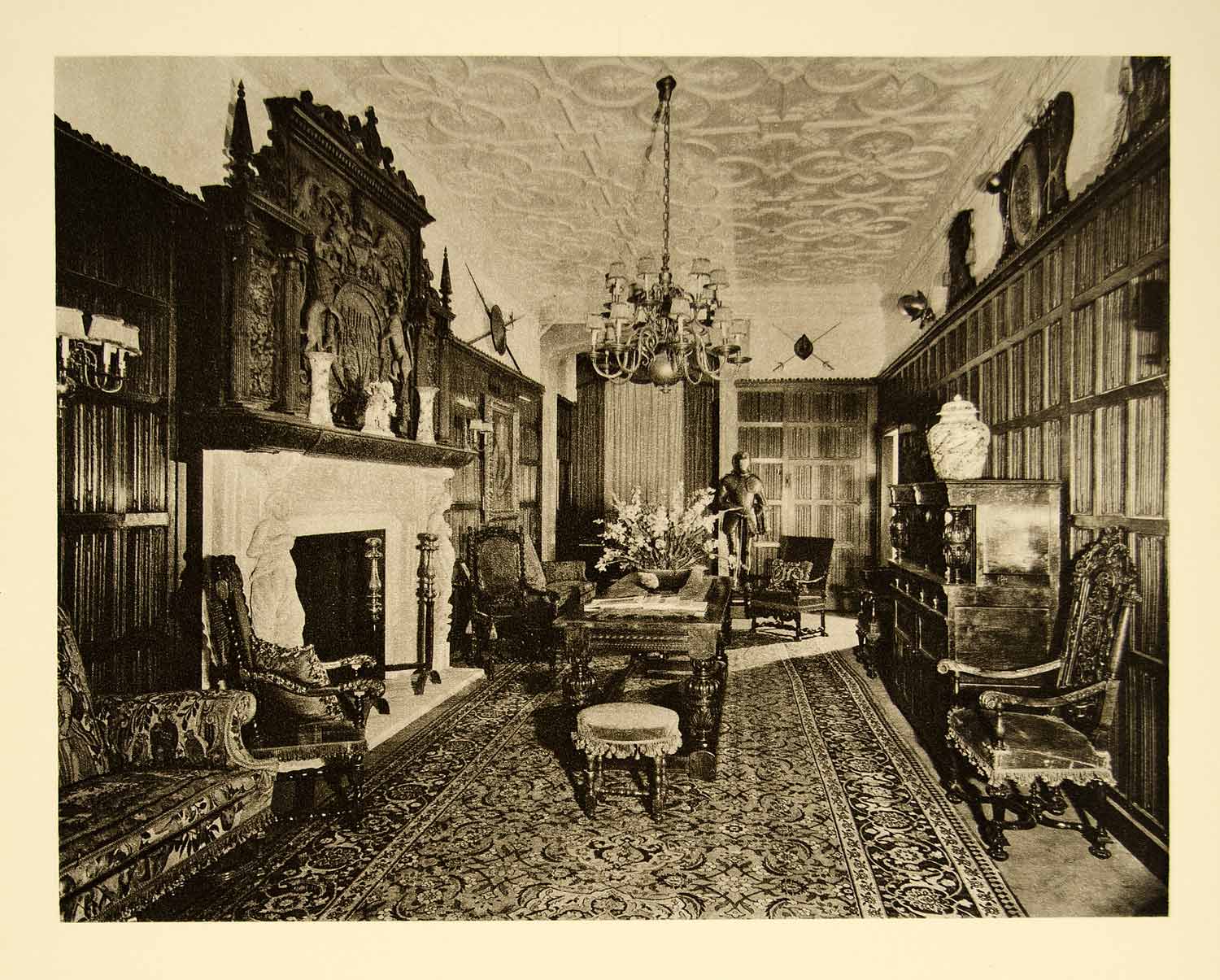 Keywords specific to this image: Home, Estate, Mansion, Manor, UK, England, Mantelpiece, Fireplace, Oak, Knight, Armor, Medieval, Steel, Suit, Carpet, Rug, Upholstery, Chair, Table, Chandelier, Coat of Arms, Conquistador Helmet, Sword, Rapier, Couch, Pillow, Urn, Stool, Flower, Floral, Bouquet, Bowl, Pattern, Cushion, Fringe, Furniture